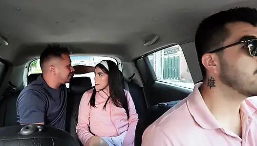 Автостопщица играет с водителем на переднем сиденье